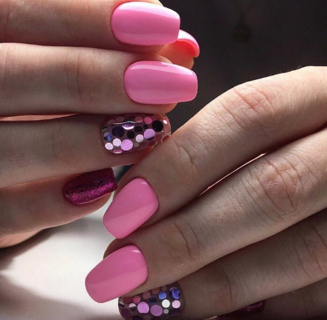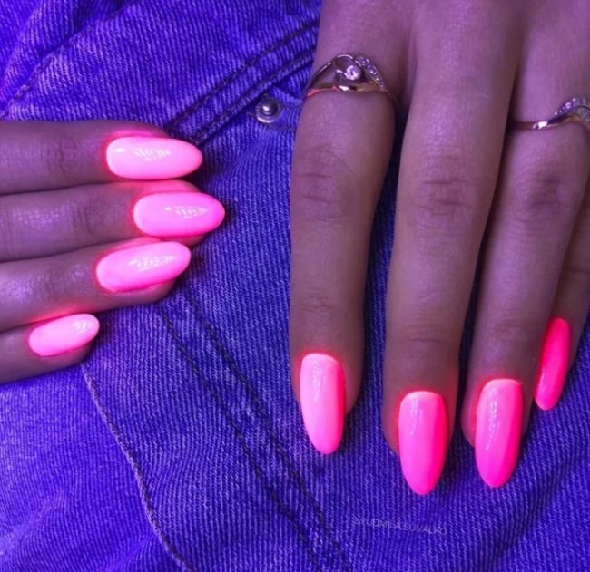 В списке модных тенденций снова ярко-розовый гель-лак. Такой маникюр сегодня все чаще встречается на фото у знаменитых блогеров. Он броский, стильный и очень крутой. Попробуйте сделать неоновый дизайн или покрасить ногти в сочный малиновый оттенок. С таким оформлением ноготков вы точно будете выделяться из толпы.