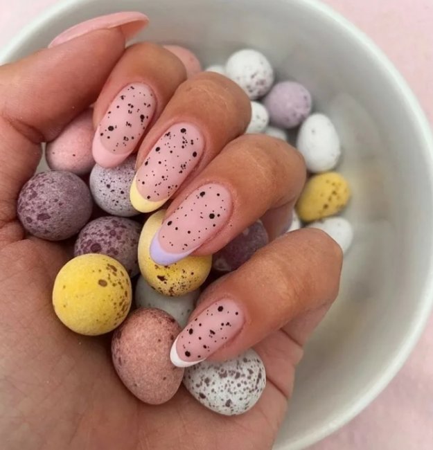 Если у вас появилось желание сделать неординарный дизайн, можно попробовать маникюр «перепелиное яйцо». Ногти покрывают любимым оттенком розового, а сверху добавляют мелкие точки черного цвета. Это новый тренд в мире нейл-индустрии, который смотрится очень круто.