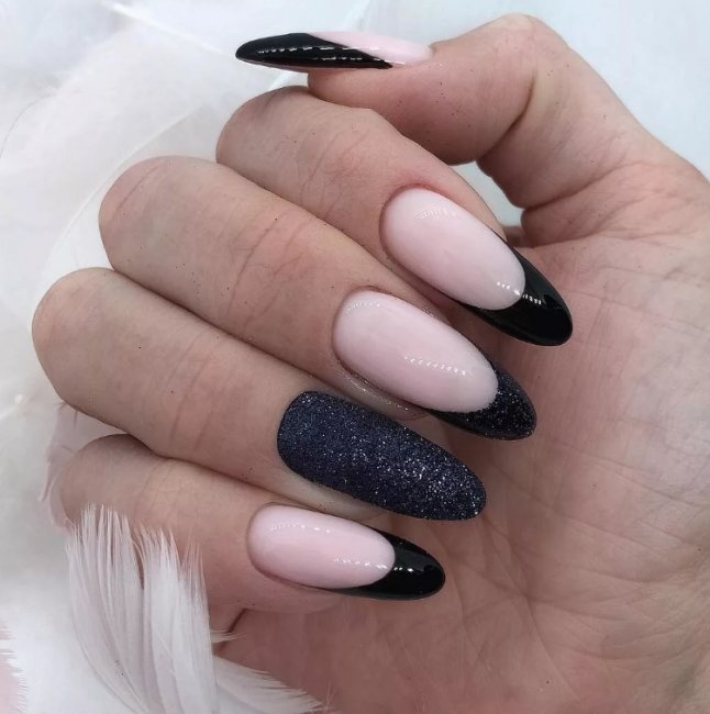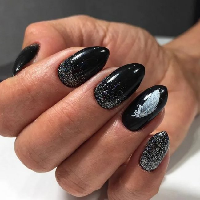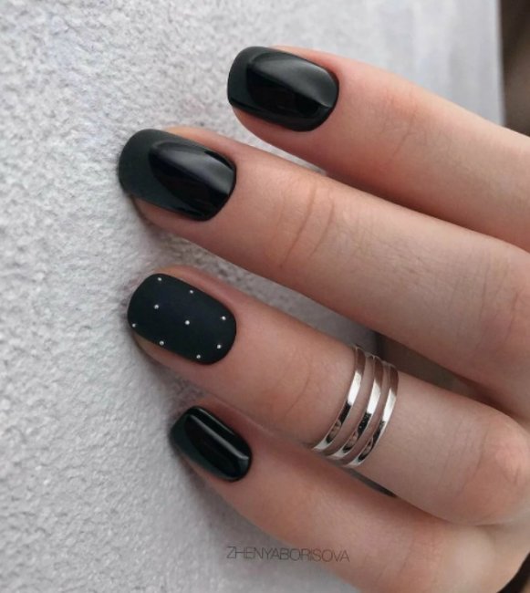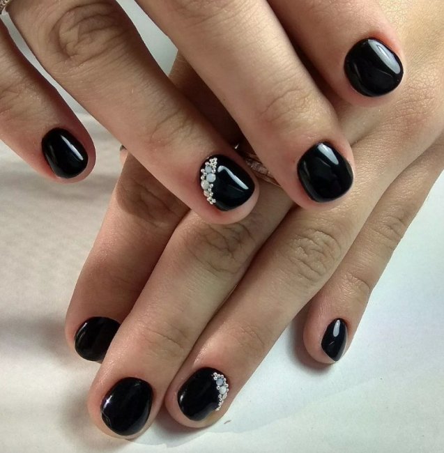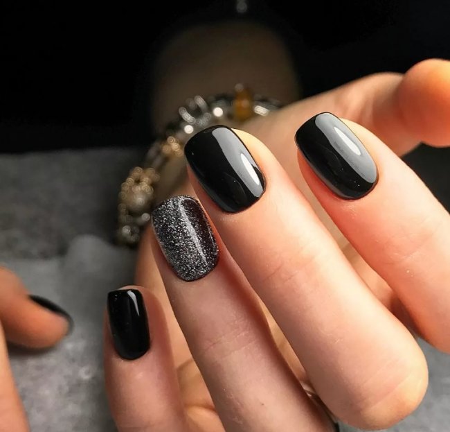 Черный маникюр отлично подчеркнут стразы, блестки и пайетки. Их обычно наносят на несколько ногтей, но вы можете добавить их на все. Только обратите внимание, что в большом количестве эти элементы декора могут сделать маникюр вульгарным.