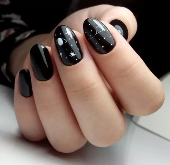 Также в 2023 году стоит обратить внимание на дизайн «звездное небо». Он подойдет загадочным девушкам. Если вы любите наблюдать, как падают звезды, или рассматривать созвездия, этот вариант точно для вас. Попробуйте покрыть все ногти черным матовым топом, а на безымянный палец нанести любимое созвездие. Лучше отдать предпочтение квадратным ногтям средней длины.