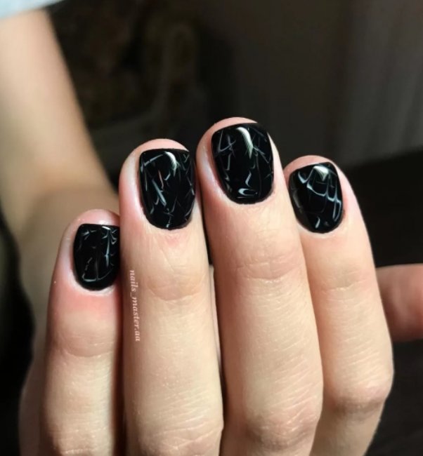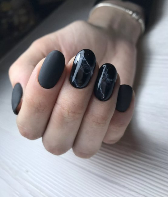 В топ лучших идей также входит мраморный черный маникюр. Это тандем роскоши и простоты. Он нравится девушкам из-за универсальности и красивого вида. Такой маникюр всегда будет выглядеть шикарно и стильно, а выполнить его может даже новичок. Мраморный маникюр в черном оформлении будет притягивать взгляды.