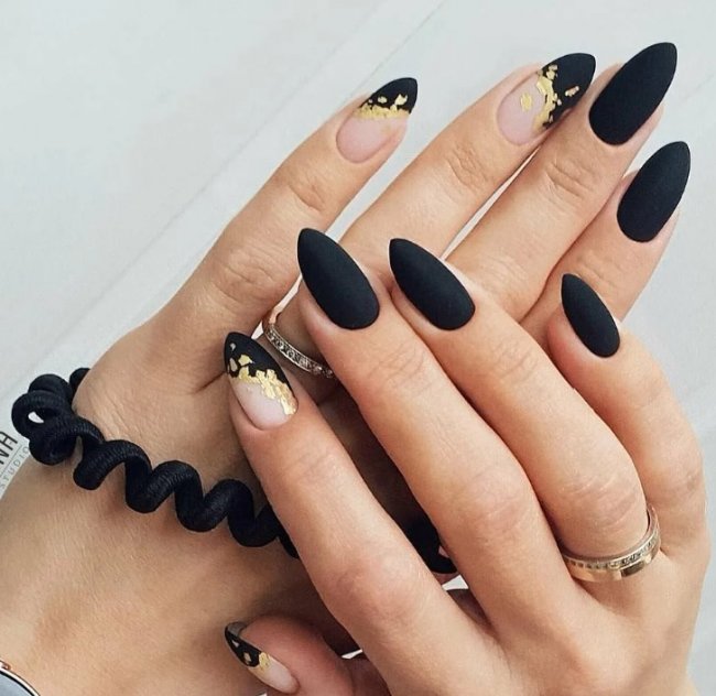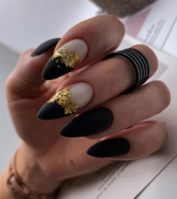 Популярным вариантом на длинные черные ногти стал дизайн с поталью. Это имитация сусального золота. Такое оформление ноготков добавляет любому образу нотку шарма, смотрится дорого и аристократично. В тандеме с черным оттенком поталь делает женские ручки более элегантными и изящными.