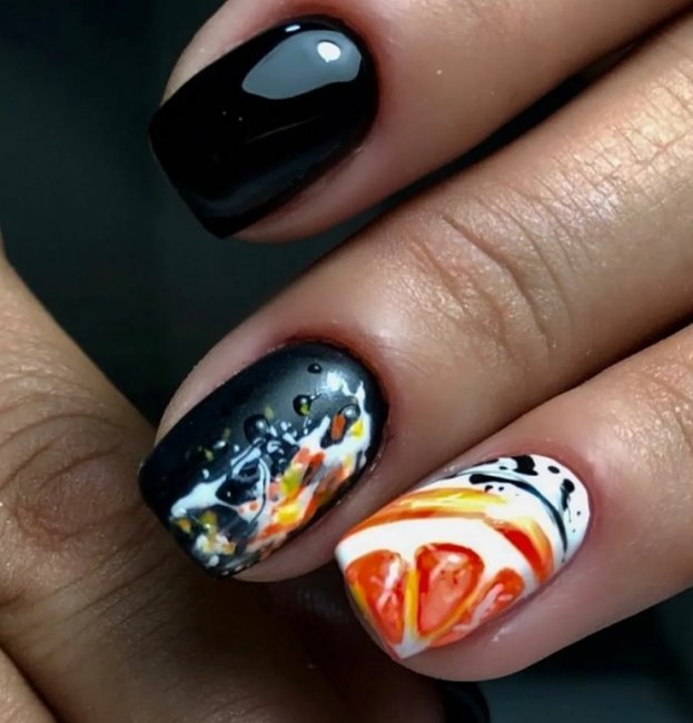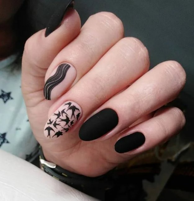 На черном фоне в этом случае красиво будут смотреться цветочные мотивы или веточки. Это лучший вариант для весеннего сезона. Рекомендуются яркие цвета. Такой маникюр сочетает в себе нотки стиля, резкости, гармонии и дерзости. Лучшие варианты: