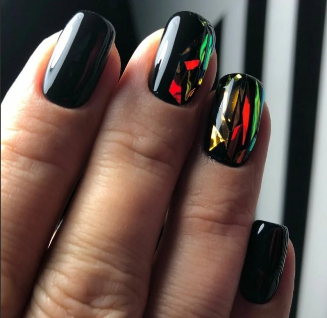 Лидирующую позицию занимает дизайн «битое стекло». Эффект достигается при помощи специальной фольги. Результат будет невероятно впечатляющим. На черной подложке голографические переливы фольги смотрятся волшебно и очень эффектно. Если добавить сюда объемные наклейки, маникюр приобретет ошеломляющий вид.