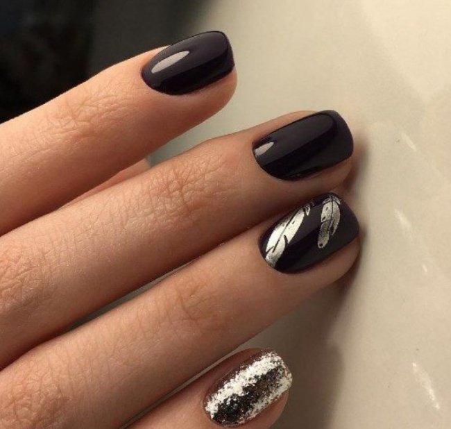 Невероятно эстетично и элегантно выглядит серебро. Такой эффект создается при помощи акриловой краски или геля, глянца, фольги, специального скотча, втирки или наклеек. Волшебный тандем — серебристые блестки и черный гель-лак. Можно создать эффект сказочного дождя, если вы нанесете блестки в малом количестве.