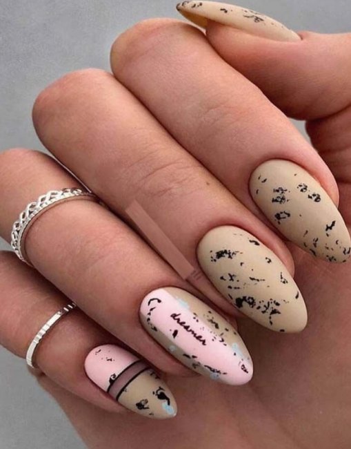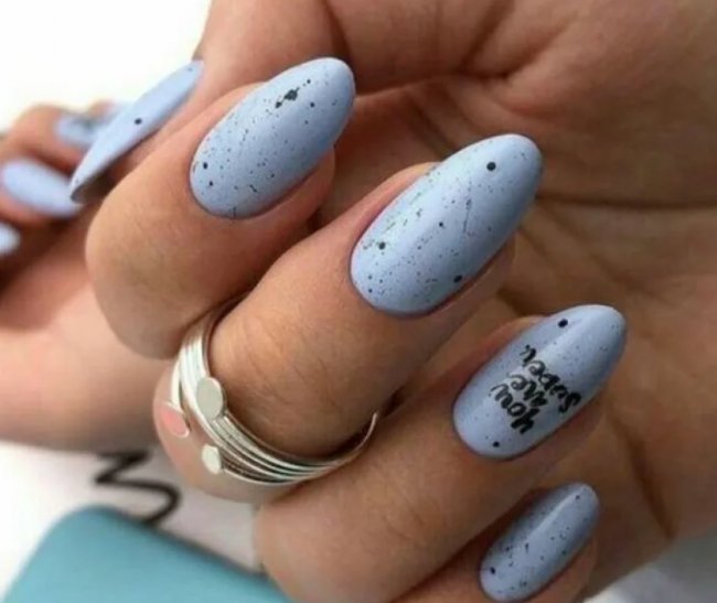 Любопытная и популярная техника, которая делает рисунок, схожий с естественным окрашиванием перепелиных яиц. При этом оттенки можно подбирать самые разные, необязательно останавливаться на натуральных. Похожая текстура отлично выполняется на любых ногтях.