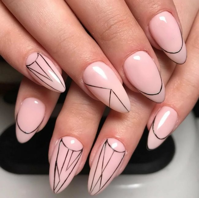 На миндалевидных ногтях во всей красе можно показать различные геометрические рисунки. На ногте достаточно свободного места, чтобы рисовать, применять контрастные цвета фигур и форм. Такой маникюр обязательно привлечет внимание.