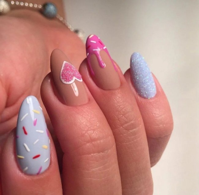 Подходит любительницам сладостей. В выборе рисунков практически нет ограничений — можно отображать на ноготках любимые пончики, шоколадки, мороженое, зефир, тортики и пирожные. Общая цветовая гамма может быть любой: розовая, мятная, желтая, белая.
