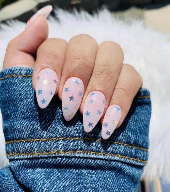 Загадочный и таинственный дизайн выбирают часто романтичные и творческие девушки. Он хорошо подойдет тем, кто любит всматриваться в звездное небо. Нередко его разбавляют блестками, стразами и фольгой.