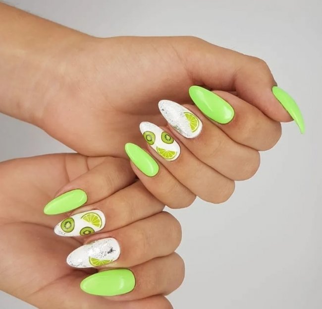 Ногти с нарисованными фруктами выглядят свежо и красиво, напоминают о лете. Подобный маникюр делают в основном в теплое время года и сочетают с легкими воздушными нарядами. Такие ноготки хорошо сочетаются даже с купальником на пляже.