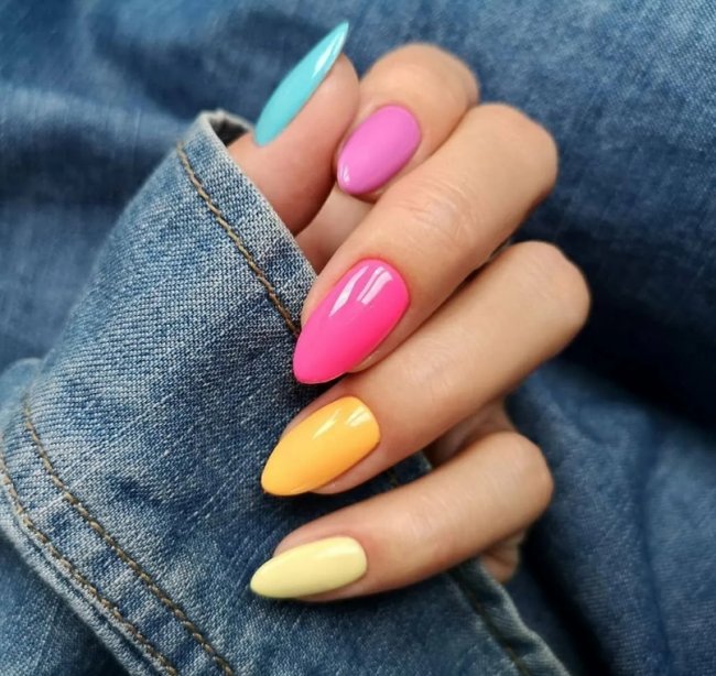 Такой маникюр на миндальную форму ногтей 2023 года идеален для летнего времени.