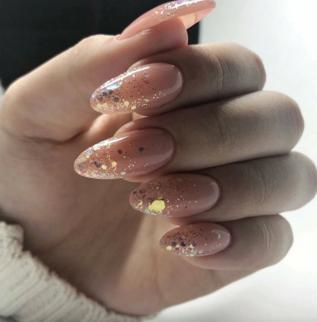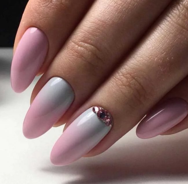 Красивое омбре лучше всего смотрится на удлиненной миндалевидной форме. Но и укороченную форму оно визуально удлиняет. Смотрится утонченно и красиво, идеально подойдет как для праздничного дизайна, так и для скромного нежного маникюра, с которым можно пойти в офис.