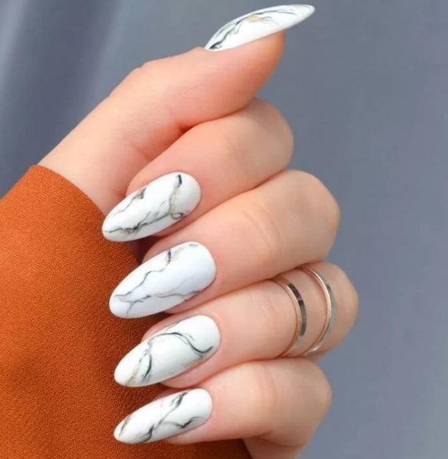 Имитация мрамора на ногтях смотрится дорого и женственно. Специалисты советуют выбирать оттенки, схожие с природными цветами камней: белые, серые, голубые, синие и зеленые.