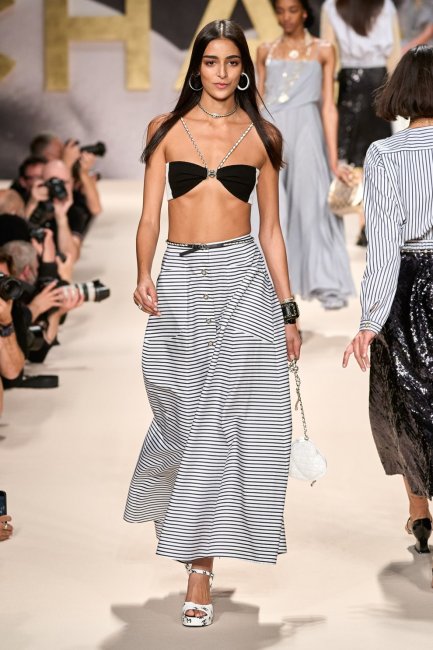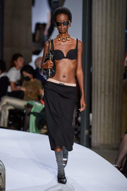 Низька посадка, натхненна нульовими роками, м'яко проникла до нас у гардероби. Ще кілька років тому ми не замислювалися, що знову носитимемо штани та спідниці з низькою талією, проте мода циклічна, і через 20 років цей тренд повернувся до нашого життя. Дизайнери цього літа пропонують поєднати речі з низькою посадкою з топами-бра, відкриваючи лінію преса. Так, на шоу Miu Miu моделі дефілювали у спідницях на стегнах у дуеті з гладенькими бюстгальтерами, Versace скомбінували витончені бра з шовковими спідницями з хустковим принтом, а Brandon Maxwell зробили ставку на брючний сет із чорно-білим забарвленням.