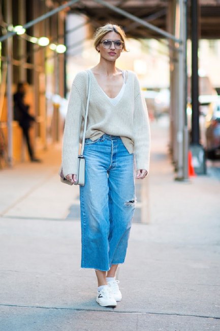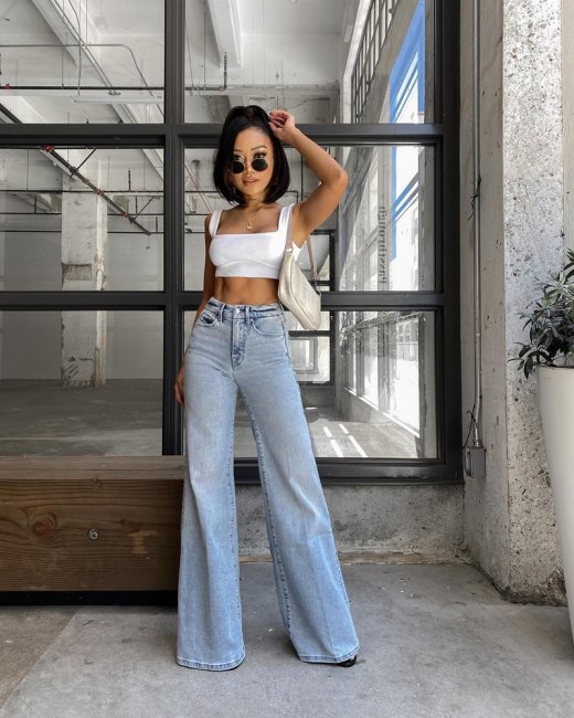 Широкие джинсы считаются одной из наиболее популярных моделей в 2023 году. С ними хорошо сочетаются кроп-топы, блузки и свободные футболки. Что касается обуви — ограничений нет, выбирайте любую: кроссовки, кеды, туфли на каблуке.