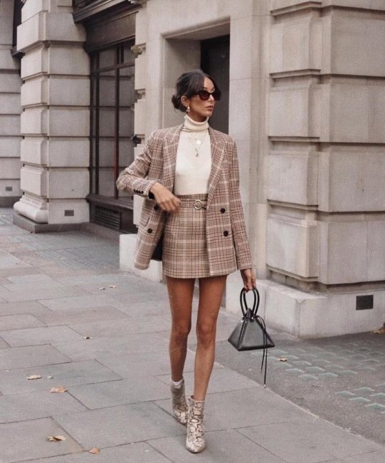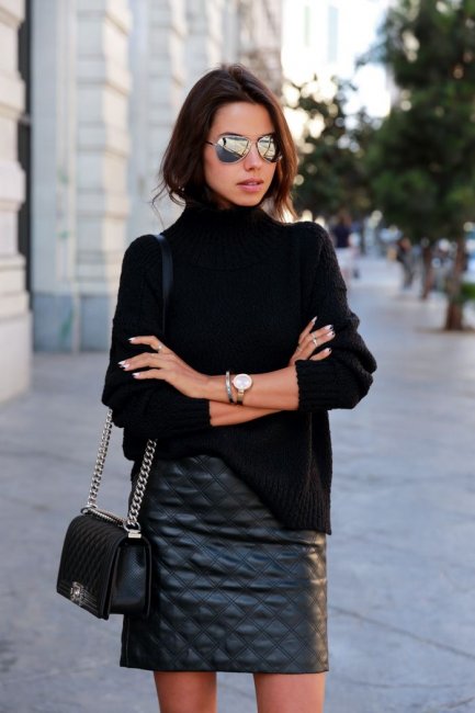 Если вы хотите создать более экстравагантный образ, лучшей идеей станет сочетание мини-юбка + укороченная кожаная куртка черного цвета. Это смелый образ для самых стильных дам. В теплое время года такую одежду стоит носить с кедами, а в холодное можно дополнить плотными колготками и сапогами-трубами.