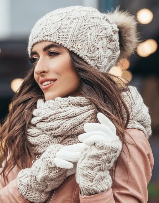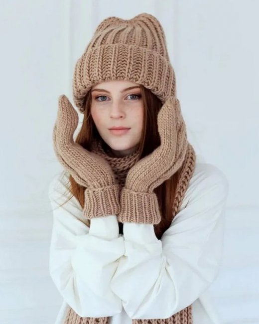 В 2023 году будут актуальными модели крупной вязки. Можно составить интересный комплект из берета, шарфика и варежек одного типа. Они будут гармонично смотреться с пуховиками, легкими короткими куртками, пальто.