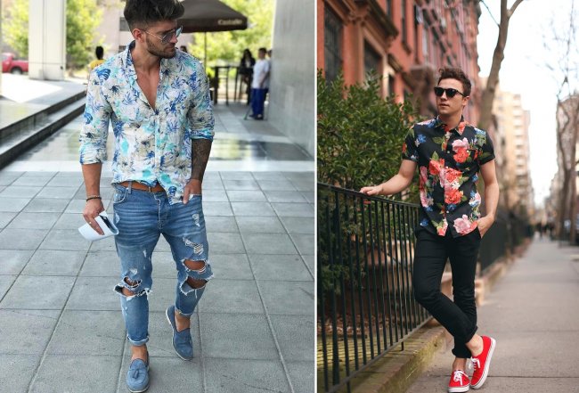 Один из главных принципов стиля – обилие различных аксессуаров. Рубашку с цветочным принтом, заправленную в брюки, отлично дополнят солнцезащитные очки и часы. В качестве обуви стоит выбрать сапоги или кроссовки.