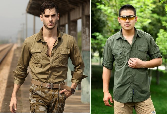 Военный стиль набирает обороты в последние годы и подходит всем мужчинам. В 2023 году рубашки-милитари должны быть в каждом гардеробе. Классический образ данного стиля – модель с коротким рукавом, заправленная в штаны с большим количеством карманов. Дополнить образ помогут солнцезащитные очки разнообразные украшения из металла. Стиль милитари подходит для дружеских встреч и путешествий.