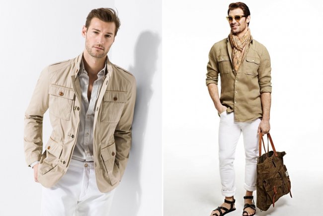 В этом сезоне «сафари» всё еще остается в моде, хоть модельеры и отмечают падение интереса к данному стилю. Мужская рубашка природных оттенков удачно смотрится с зауженными брюками цвета хаки. Остается лишь дополнить образ бежевым пиджаком с карманами и замшевыми ботинками, аксессуарами и поясом.