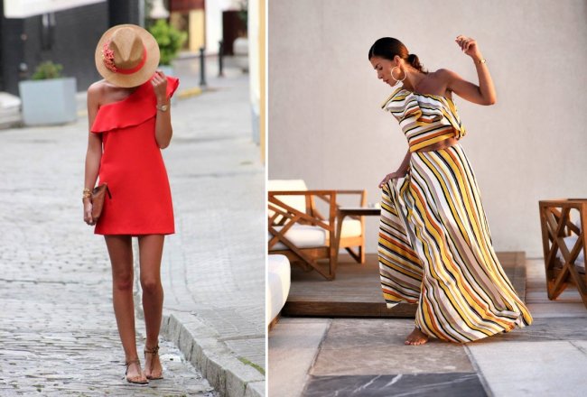 Асимметрия, часто использующаяся в классических моделях платьев, теперь подчеркивается не только кроем плеча, но и другими элементами декора.