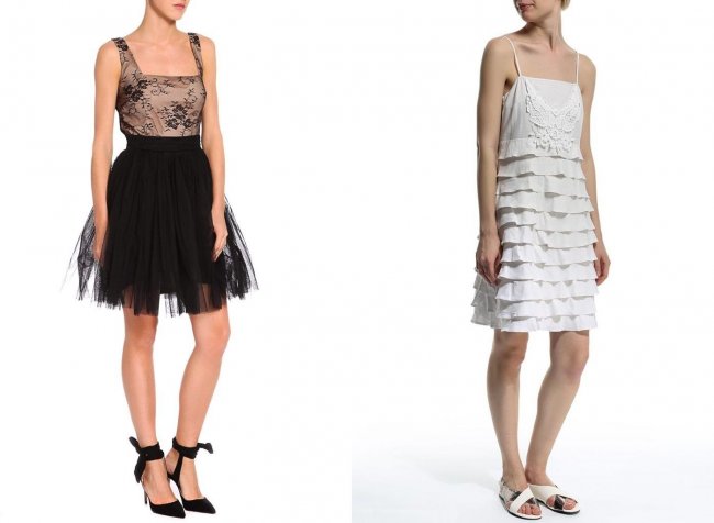 Объемные сарафаны длины мини. Достаточной ширины платья удается достигнуть благодаря множеству оборок.