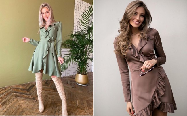 В топовых версиях 2023 года можно проследить разные фактуры, цвета и крой. Такие платья созданы как для летних луков, так и на холодный сезон. Удлиненным фасоном с запахом и рюшами можно отлично дополнить деловой лук, а мини-платьем с воланами — легкий аутфит или праздничный вечерний образ.