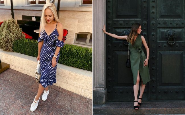 При этом стоит отметить, что даже самые нарядные и женственные вариации платьев с запахом не испортит спортивная обувь и обувь на низком ходу.