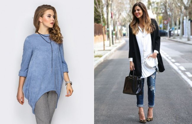 Максимально непринужденно и комфортно позволят себя чувствовать модные туники разной длины и джинсы фасона клеш или прямого кроя с обувью на каблуке или платформе.
