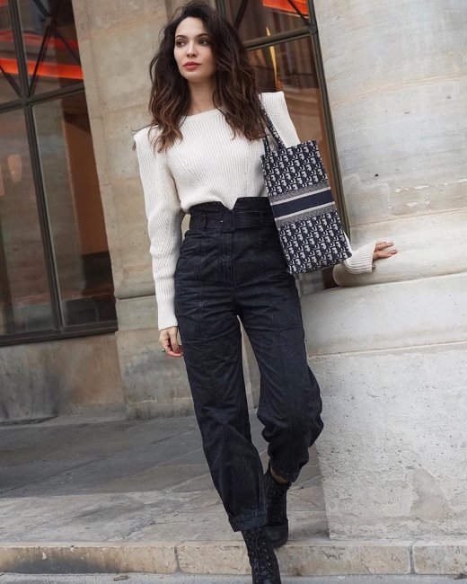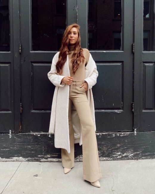 - Для создания офисного лука станут находкой модели в пол. Дизайнерами предлагаются варианты клёш или палаццо. Посадка будет завышенной, такая модель отлично сочетается с поясом или защипами в области талии. Брюки требуют дополнения обувью на каблуке или высокой танкетке. В качестве верха подойдёт свободный укороченный свитер или водолазка, заправленная внутрь.