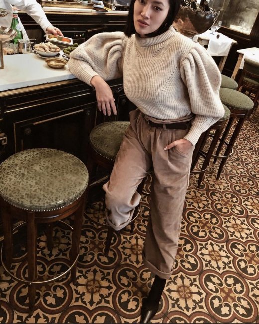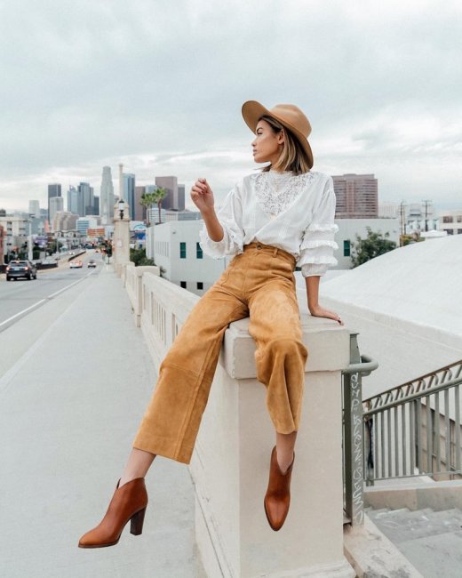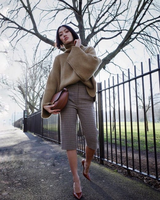 - В тренде продолжают оставаться кюлоты, которые делают незначительно расклешенными или сильно расширенными, напоминающими юбку. Штаны носят с ботильонами, демонстрируя красоту щиколотки и голени. Другой вариант – подобрать высокие сапоги, скрывающиеся под штанинами. Кюлоты гармонично сочетаются с водолазкой под горло или свитером, прилегающим по фигуре.