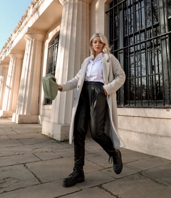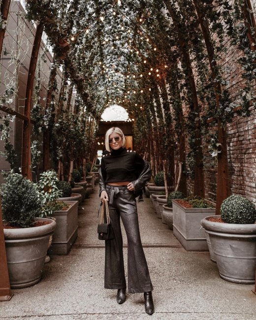 - Для осеннего сезона отлично подойдут кожаные брюки. Вниманию модниц предлагаются фасоны, облегающие фигуру, выполненные в прямом или расклешённом крое. Преобладают штаны, созданные в классическом чёрном цвете. При желании сделать вещь акцентом образа подойдут яркие цветные модели или варианты, дополненные анималистическими принтами.