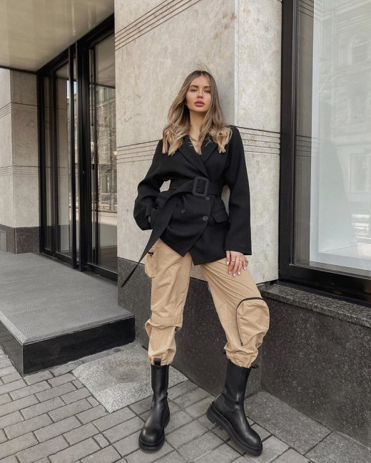 - Любительницы молодёжного неформального стиля оценят брюки-милитари. При создании изделия предпочтение отдаётся характерному цвету хаки либо бежевому оттенку. Встречаются варианты с камуфляжным принтом. Штаны комбинируют с грубыми берцами на шнуровке или челси, дополненными массивной подошвой.