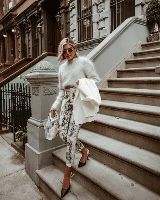 - Воплотить модный городской образ помогут брюки, имеющие расцветку «под питона». Верх и обувь рекомендуется подбирать в одном из оттенков, совпадающих с принтом.