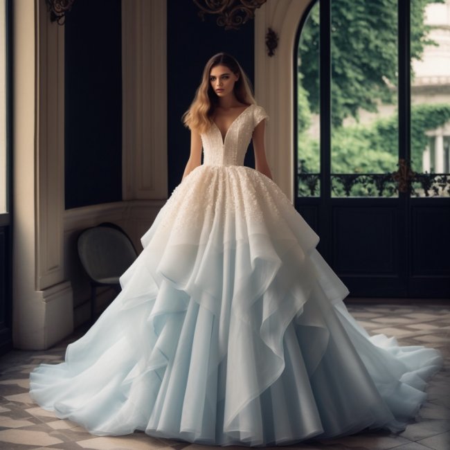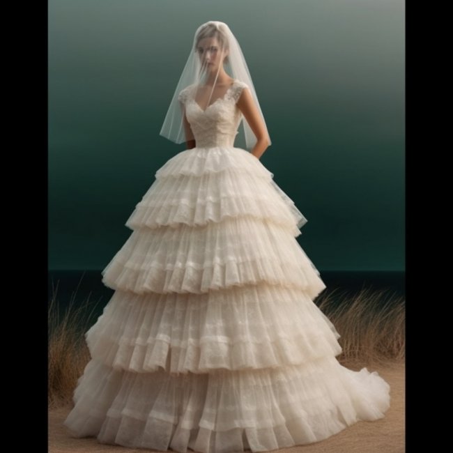 - Максимально романтичный лук создаётся с многоярусным платьем, дополненным каскадной юбкой. Слои располагаются в несколько уровней, идущих друг над другом. Пышный эффект воплощается с помощью многослойного фатина.