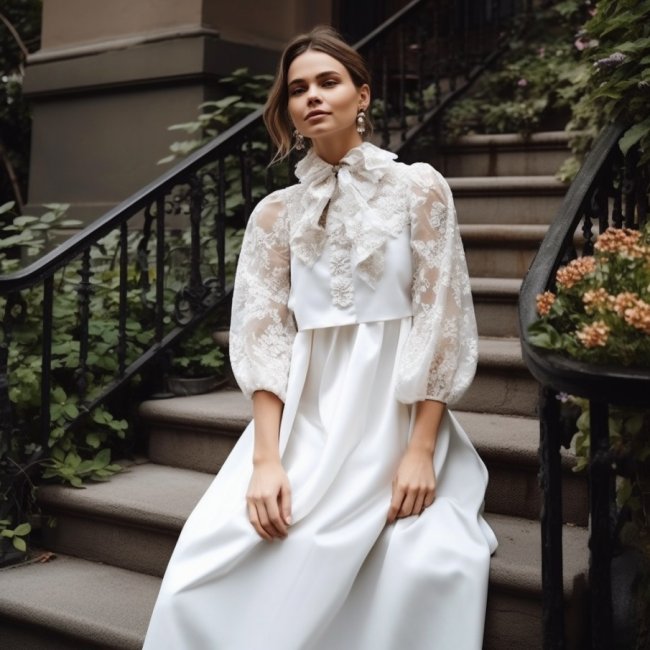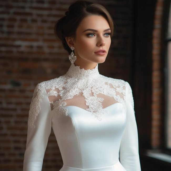 - Подчёркнуто элегантный стиль помогут воплотить модели с высоким закрытым воротником. Деталь стала одной из новинок свадебной моды. Воротник может выполняться из плотной ткани или создаваться в кружевном, сетчатом, полупрозрачном варианте.