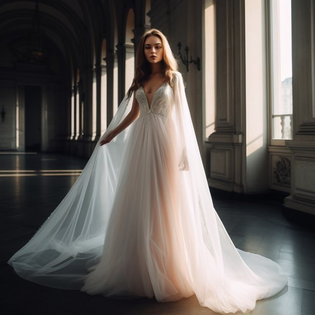 - Оригинальной новинкой стала модель, дополненная накидкой-кейпом. Фасон станет находкой для девушек, желающих обойтись без фаты, наряд органично смотрится с распущенными волосами. Накидка, надевающаяся поверх платья с открытыми плечами, выполняется из просвечивающейся ткани.