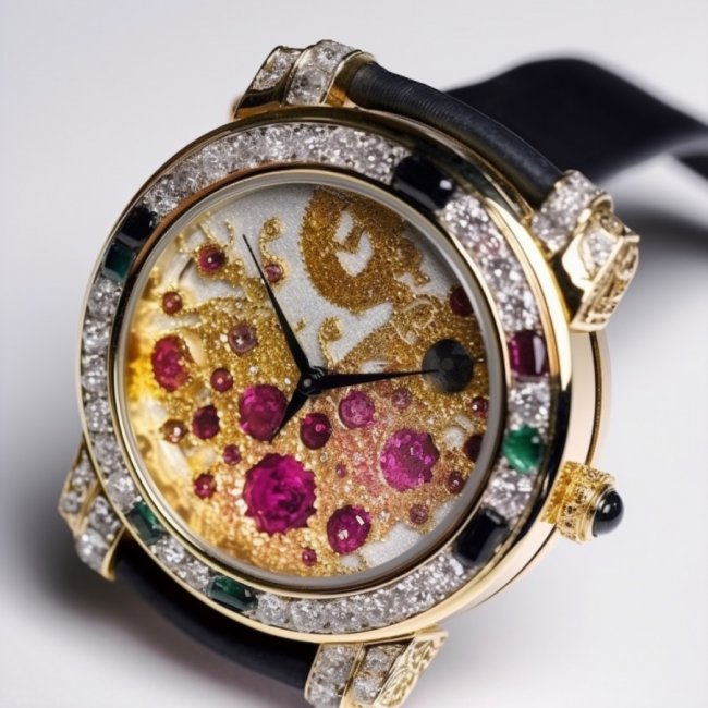 - Любительницы роскоши оценят варианты, щедро декорированные камнями. При создании дизайна предпочтение отдаётся золотистой или серебристой цветовой гамме. Циферблат оформляет россыпь мелких страз или объёмные разноцветные камни.