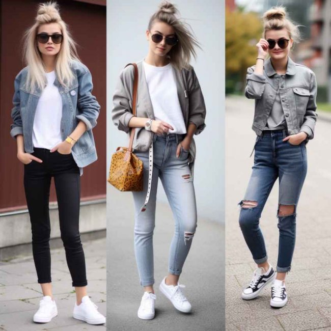 Беспроигрышным вариантом будет сочетание кедов с джинсами всевозможных фасонов. Верх подбирают в соответствии с индивидуальными предпочтениями: в виде футболки, рубашки, женственной блузки, топа или водолазки, пиджака, свитера, кардигана.