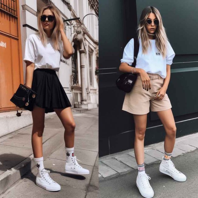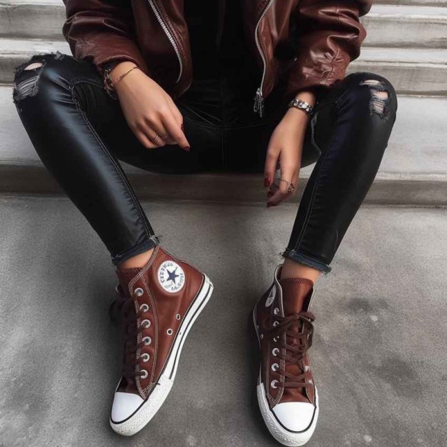 Стильные конверсы заслуженно считаются универсальной разновидностью обуви. Особенно это актуально для моделей, выполненных в черно-белых расцветках. Конверсы можно совмещать с рваными джинсами и брутальными кожаными «косухами». Наряд получится дерзким и отлично впишется в молодежные образы. При желании сделать лук элегантным прибегают к сочетанию конверсов с классическими прямыми или облегающими фигуру брюками, пальто либо тренчами.