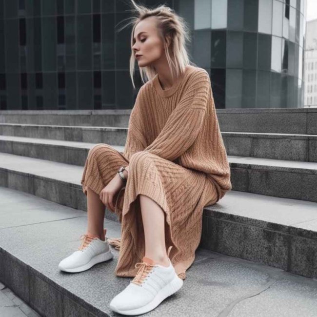 Лаконичные однотонные кеды, выполненные в сдержанных расцветках, можно комбинировать с трикотажной юбкой-карандаш. Образ можно дополнить водолазкой под горло, пиджаком оверсайз или вязаным кардиганом.
