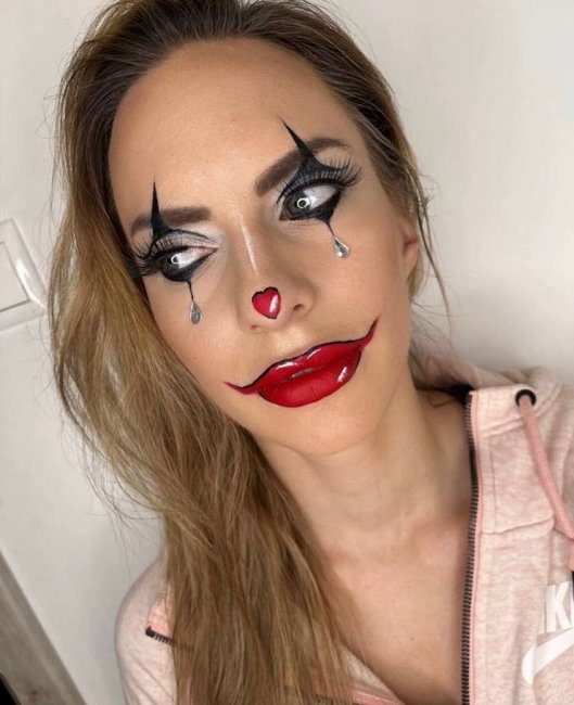 Один из самых легких персонажей, по мнению стилиста. Юлия рассказывает, как «подойти» к образу: «Приклейте стразы на лицо в виде слез, также можно нарисовать слезы черным гримом. Форму бровей отените черным цветом с сильно опущенными внешними уголками, этот прием придаст вам дополнительный эффект грусти. На лицо накладывается белый грим Последний штрих — нарисованная улыбка с закругленными уголками». Подготовьте все необходимое заранее, и, кстати, вы можете помочь собраться своим друзьям, если они также еще не решили, в кого перевоплотиться в эту страшную ночь.