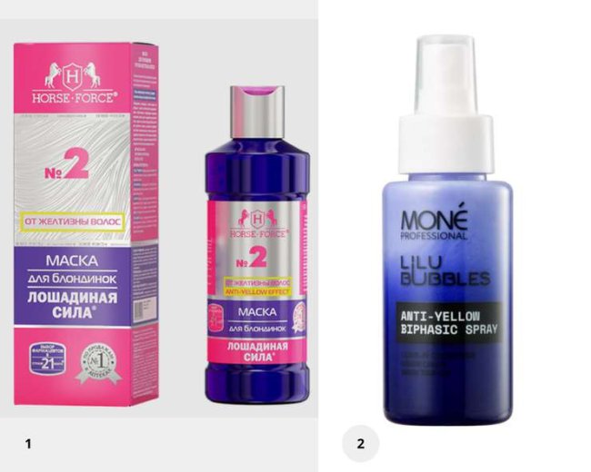 1. Маска для блондинок против желтизны волос, Буренка. 2. Бифазный кондиционер для нейтрализации желтизны, Anti-Yellow Biphasic Spray, Mone Professional.