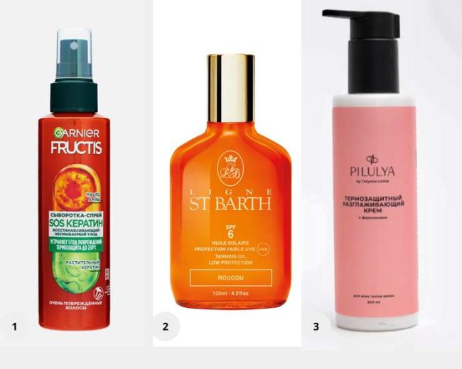 1. Сыворотка-спрей для поврежденных волос Fructis SOS Кератин 10 в 1, GARNIER. 2. Масло помадного дерева для загара, ST BARTH Solaire. 3. PILULYA, Термозащитный разглаживающий крем с феромонами.