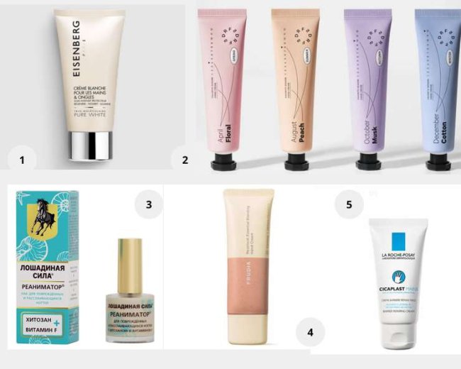 1. White hand & nail cream/Крем для рук и ногтей формула trio-moléculaire, Eisenberg. 2. DR.F5 Набор кремов для рук «любимый сезон». 3. «Лошадиная сила» Реаниматор для поврежденных и расслаивающихся ногтей с хитозаном и витамином F. 4. FRUDIA крем для рук с мандарином и розмарином. 5.La Roche-Posay Крем-барьер для поврежденной и подверженной постоянному внешнему раздражению кожи рук Cicaplast.