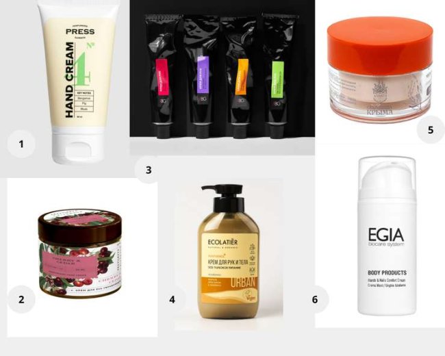 1. Крем для рук Press Gurwitz №4. 2. Увлажняющий питательный крем для рук, от трещин и шелушений, для заживления, смягчающий, Вишня & Кедр, Pravilnaya Kosmetika. 3. Парфюмированный крем для рук, RBG. 4. Крем для рук и тела «SOS Глубокое питание» (марула, орех кукуи & пантенол), Elolatier. 5. Воск-крем для рук заживляющий Лаванда, Сокровища Крыма. 6. EGIA Biocare system, Hands & Nails Comfort Cream, Крем для рук восстанавливающий.
