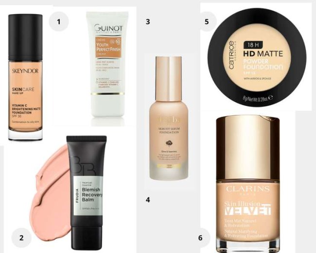 1. Тональный крем матирующий с витамином С и SPF30 Skeyndor Skincare Make-up. 2. Frudia BB крем с центеллой SPF50. Тональный крем матирующий с витамином С и SPF30. 3. Youth Perfect Finish SPF50, Guinot. 4. d’Alba Тональная основа Skin Fit Serum Foundation. 5. Тональная основа 18 H HD Matte Powder Foundation. 6. CLARINS Velvet Skin Collection/Увлажняющий тональный крем c матовым покрытием Skin Illusion Velvet.