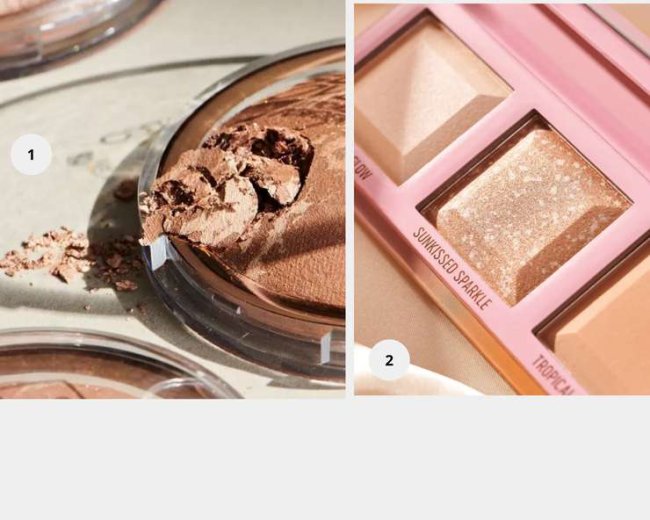 1. Матирующая бронзирующая пудра Sun Glow, Catrice. 2. Многофункциональная палетка essence Love That Glow & Bronze Palette.