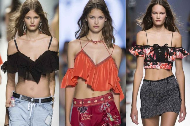 - Модные топы станут находкой для девушек, которые предпочитают летом носить верх с открытыми плечами. Дизайнеры предлагают вниманию модниц модели, напоминающие майку с «американской» проймой, кроп-топы на тонких бретелях, фасоны, сделанные в виде бюстье с выделяющимися чашечками.
