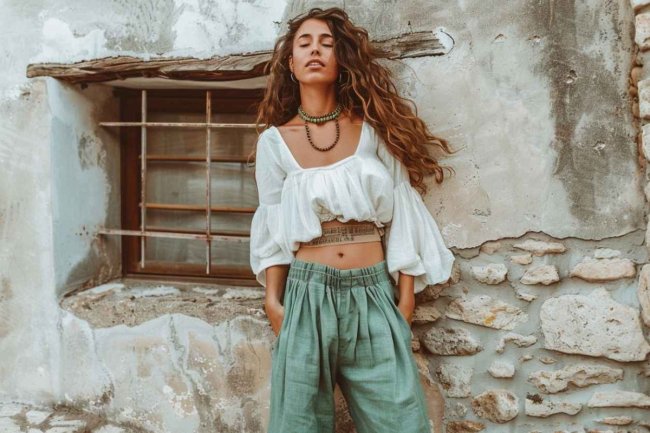 - Образ в стиле бохо создают с помощью блузки из хлопка и льна и широких брюк из аналогичных материалов или из денима. Также встречается сочетание с трапециевидной или расклешенной юбкой длины миди либо макси.